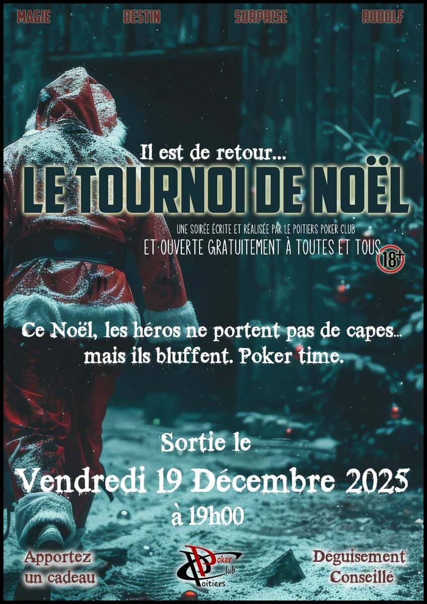 Venez vendredi 19 décembre à notre salle à partir de 19h00 pour vous amuser, pour retrouver la magie de Noel avec des cartes et des jetons. Venir déguisé serait également un plus pour notre tournoi et pour votre stack de départ.